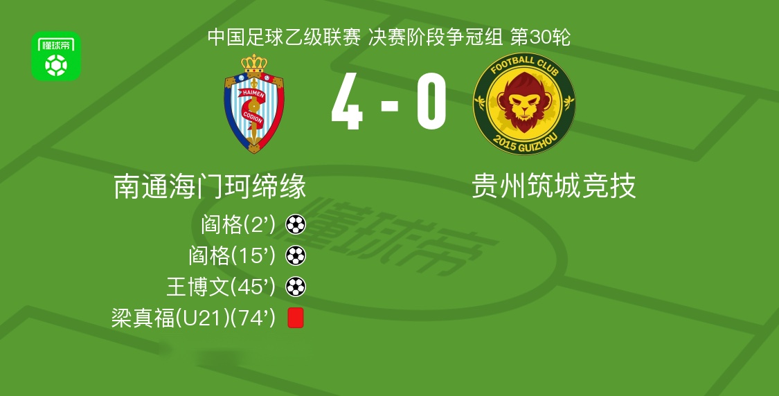 北京时间10月26日,中国足球乙级联赛决赛阶段争冠组第30轮 较量,南通海门珂缔缘主场迎战贵州筑城竞技。比赛伊始,王博文送出助攻,阎格率先破门,为球队取得领先。随后第15分钟,程鑫精准传球,阎格再下一城,完成个人本场第二粒进球。上半场临近结束前,裴国光成功策动进攻,王博文接球后冷静施射得手,进一步扩大比分优势。下半场第74分钟,梁真福因犯规被红牌罚下,球队在少一人的情况下仍保持专注。临近终场前,阎格突破防守送出妙传,徐约瑟推射破门,将最终比分锁定为4-0。全场比赛结束,南通海门珂缔缘以一场完胜收官。