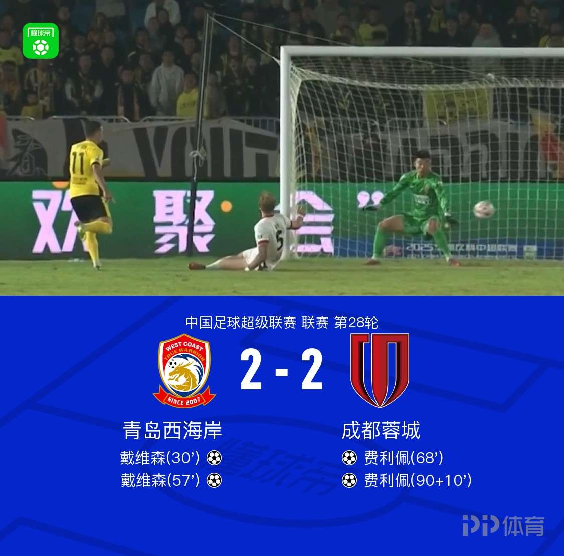 北京时间10月26日中国足球超级联赛 联赛 第28轮,青岛西海岸主场对阵成都蓉城。青岛西海岸戴维森梅开二度。成都蓉城费利佩梅开二度。最终比分青岛西海岸 2-2 成都蓉城。