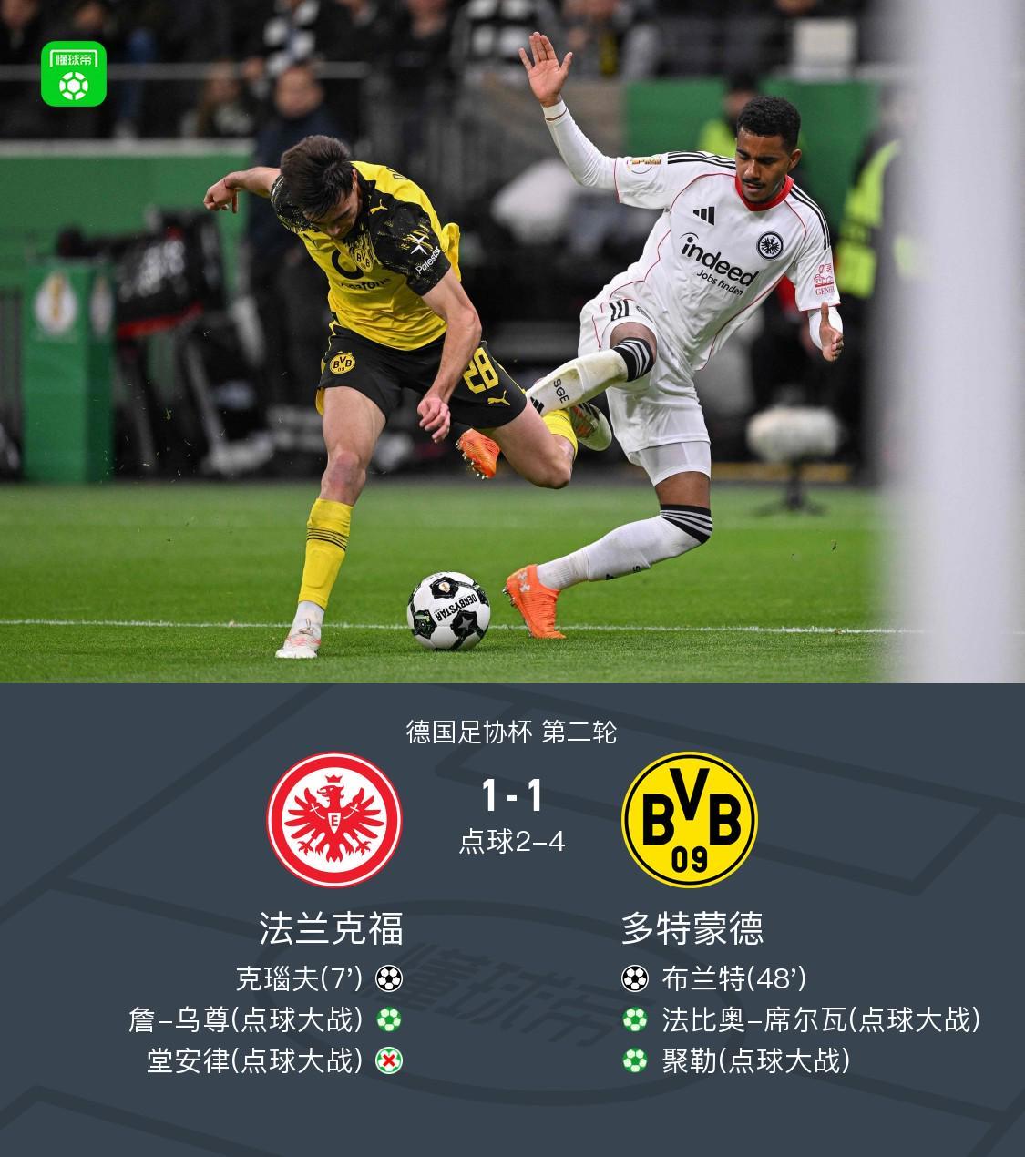 点球大战多特4-2法兰克福,总比分5-3晋级