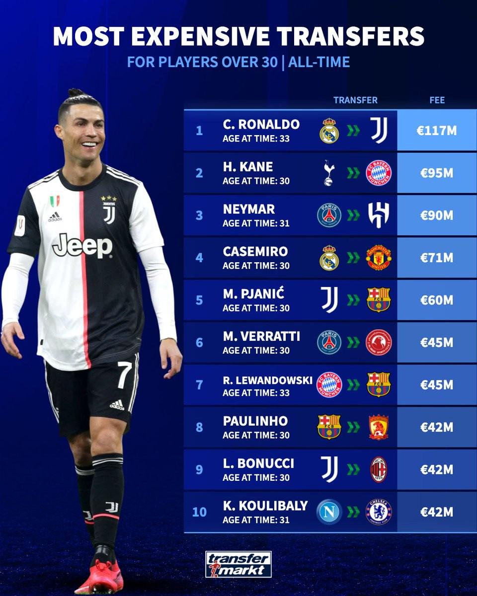 德转统计30岁以上球员转会费榜:C罗居首,凯恩内马尔分列二三