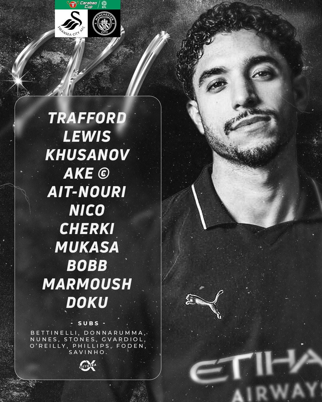 曼城首发: 1-特拉福德、82-里科-刘易斯、45-胡桑诺夫、6-阿克、21-努里、14-尼科-冈萨雷斯、10-谢尔基、52-奥斯卡-鲍勃、7-马尔穆什、11-多库、63-穆卡萨