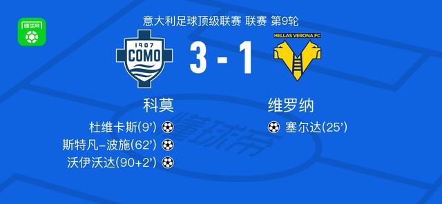 北京时间10月30日,意大利足球顶级联赛第9轮,科莫坐镇主场迎战维罗纳。比赛开局阶段,阿莱士-巴列送出助攻,杜维卡斯率先破门,为科莫取得领先。随后,维罗纳由塞尔达扳平比分,双方在上半场形成均势。进入下半场,卡克雷精准传球助斯特凡-波施建功,科莫再度将比分超出。临近结束,赫苏斯-罗德里格斯送出关键助攻,沃伊沃达冷静破门,锁定胜局。最终,科莫以3比1战胜维罗纳,全取三分。