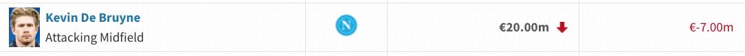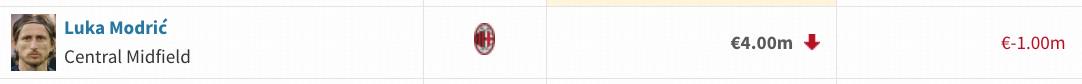 今夏登陆意甲的两位中场大师,德布劳内身价下跌至2000万欧,莫德里奇身价下跌至400万欧。