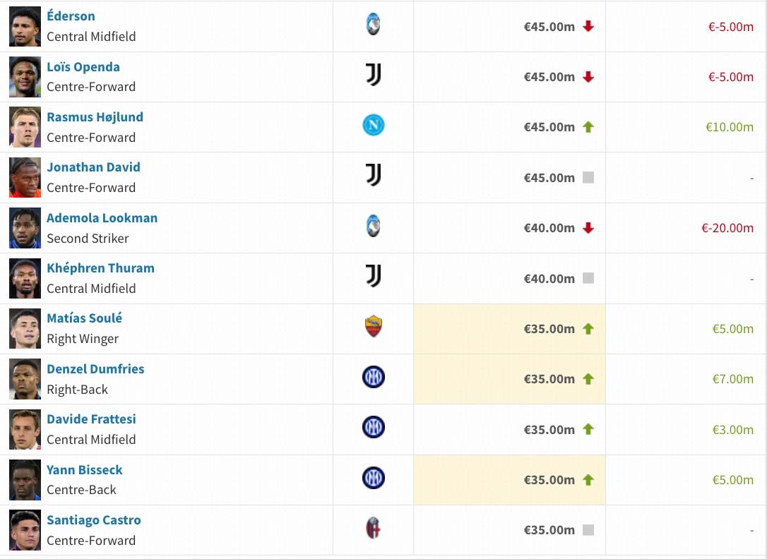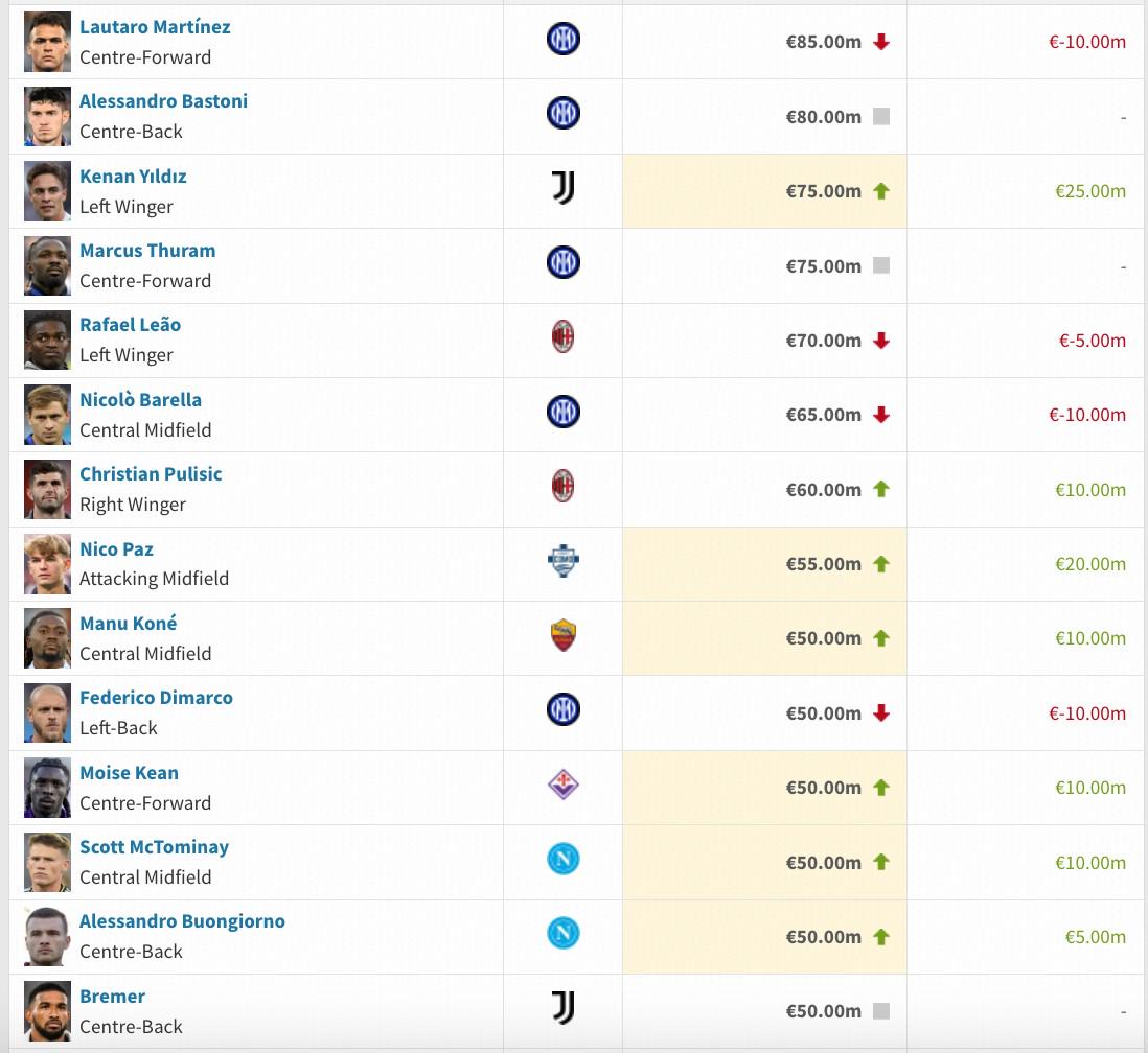 本期德转意甲身价更新中,上涨最多的是尤文新星伊尔迪兹,身价上涨2500万欧,科莫队的尼科-帕斯身价上涨了2000万欧。下跌最多的则是亚特兰大前锋卢克曼,下跌了2000万欧。
