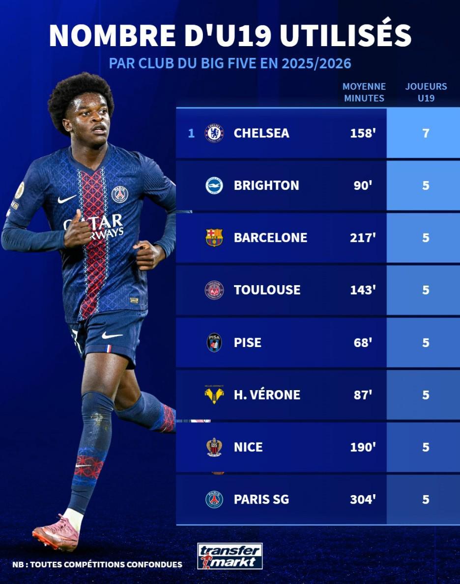 本赛季五大联赛U19球员切尔西使用人数最多,巴黎出场时间最多