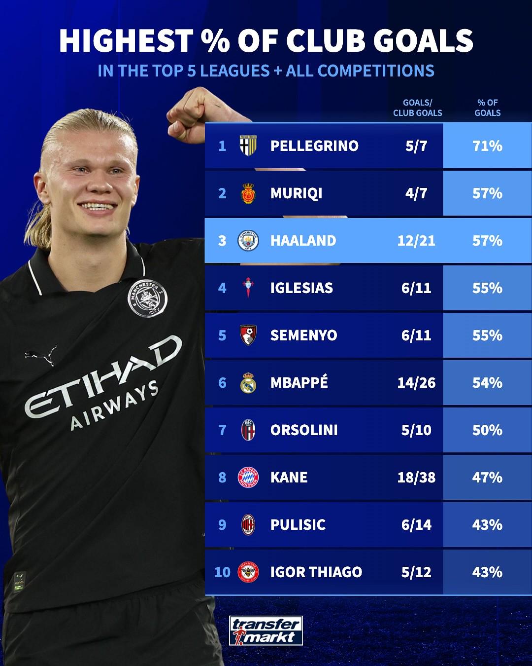 德国转会市场网站列出了本赛季五大联赛球员进球占球队总进球比例排行榜,打入12球的哈兰德以57%排名第三。