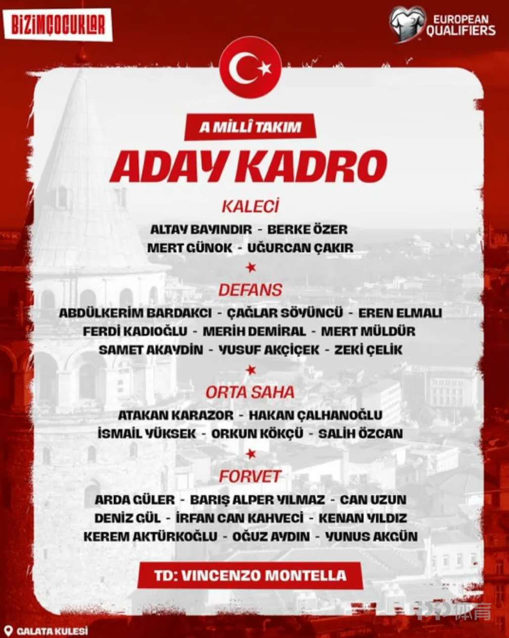 土耳其大名单:恰尔汗奥卢领衔,伊尔迪兹、居莱尔在列