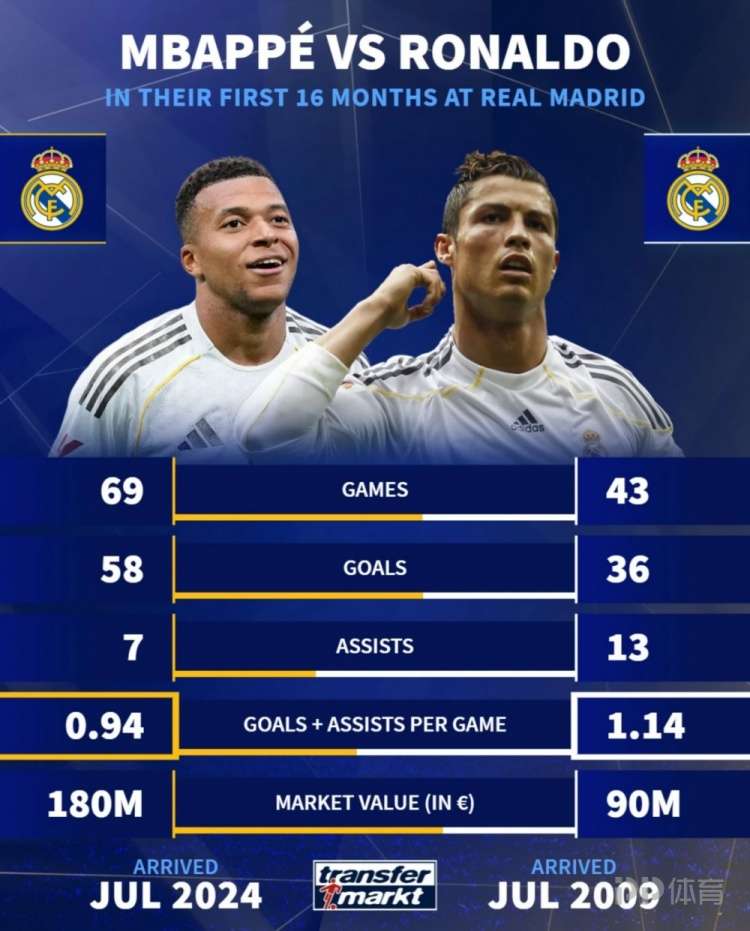 姆巴佩已为皇马效力16个月,德国转会市场统计了他与C罗在皇马同期的数据。