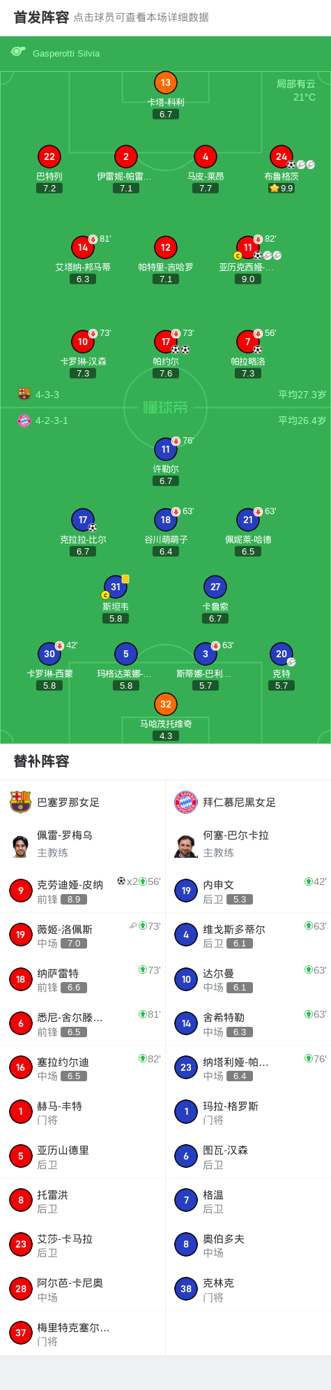 北京时间10月8日女足欧冠 联赛阶段 第1轮,巴塞罗那女足对阵拜仁慕尼黑女足。巴塞罗那女足亚历克西娅-普特利亚斯破门,帕约尔梅开二度,布鲁格茨破门,帕拉略洛破门,克劳迪娅-皮纳梅开二度。拜仁慕尼黑女足克拉拉-比尔破门。最终比分巴塞罗那女足 7 - 1 拜仁慕尼黑女足。